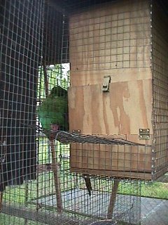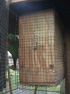 Free standing macaw cage from rear. Side panels protect the nest boxes from blowing rain and excessive exposure to the sun.